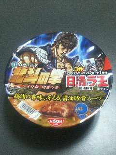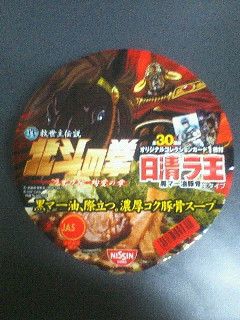 日清 説明は不要かと思いますが、北斗の拳のラオウと商品名のラ王を かけたコラボ商品です これほど安直なキャンペーンも珍しい・・・ただのオヤジギャグだし ラーメンとしては普通のラ王と変わりありません(当然といえば当然ですが しかし、おまけでカードがついている模様、早速フタをはがして中身の確認 液体スープ・・・焼き海苔・・・レトルト調理品・・・粉末スープ・・・ あったカードらしきもの!暗めの黄色い袋に北斗の拳のロゴ、そして注意書きのシンプルな袋です はさみで開けてくれということでカッターで開封 誰コレ? KENSHIROって書いてありますが、この人こんなに悪い顔してたっけ? よく見るとそう変でもないんですが、ぱっと見だと目元が暗くてなんか悪っぽい 第一印象って大事だな~、今回のことと関係ないけど まぁ、特集っぽいの(?)書いてみたけど あとはラーメンすすれば終わりなのよね 大したネタにもならなかった気がするぜー